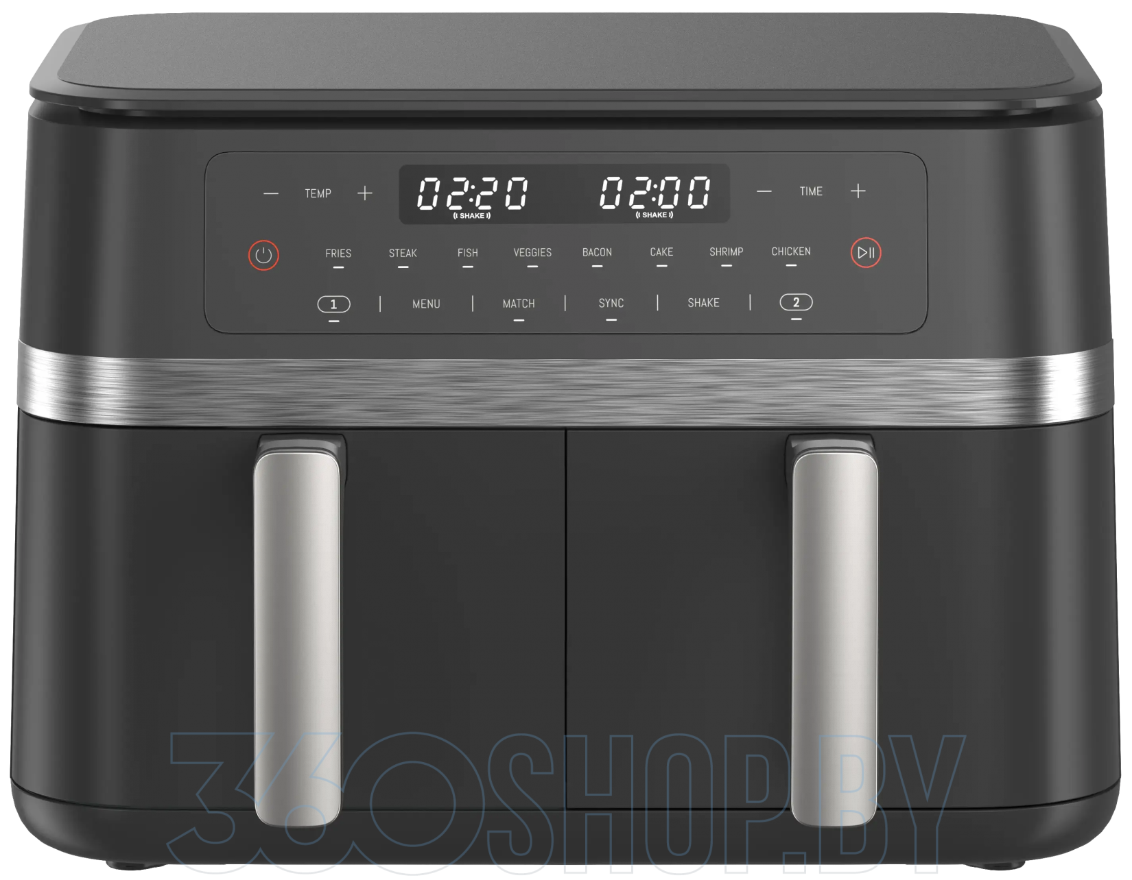 Устройство оснащено двумя корзинами суммарным объёмом 11 л, что удобно для семейных ужинов и приёма гостей. Мощность прибора — до 1500 Вт, температурный диапазон — примерно от 80 до 200 °C, таймер — до 60 минут. Сенсорная панель управления с автоматическими программами упрощает выбор режимов для мяса, рыбы, овощей и выпечки. Антипригарное покрытие корзин облегчает уход после готовки.