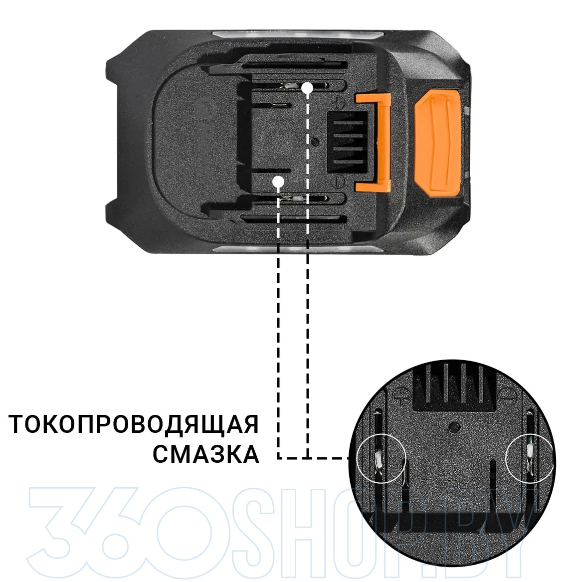 Аккумулятор выполнен на базе литий-ионной технологии с рабочим напряжением 21 В, что обеспечивает высокий уровень мощности при сравнительно небольшом весе. Ёмкость батареи позволяет инструменту работать продолжительное время без подзарядки, а встроенная система защиты предотвращает перегрев, короткое замыкание и глубокий разряд. Отсутствие эффекта памяти позволяет заряжать аккумулятор в любой момент без потери ресурса.