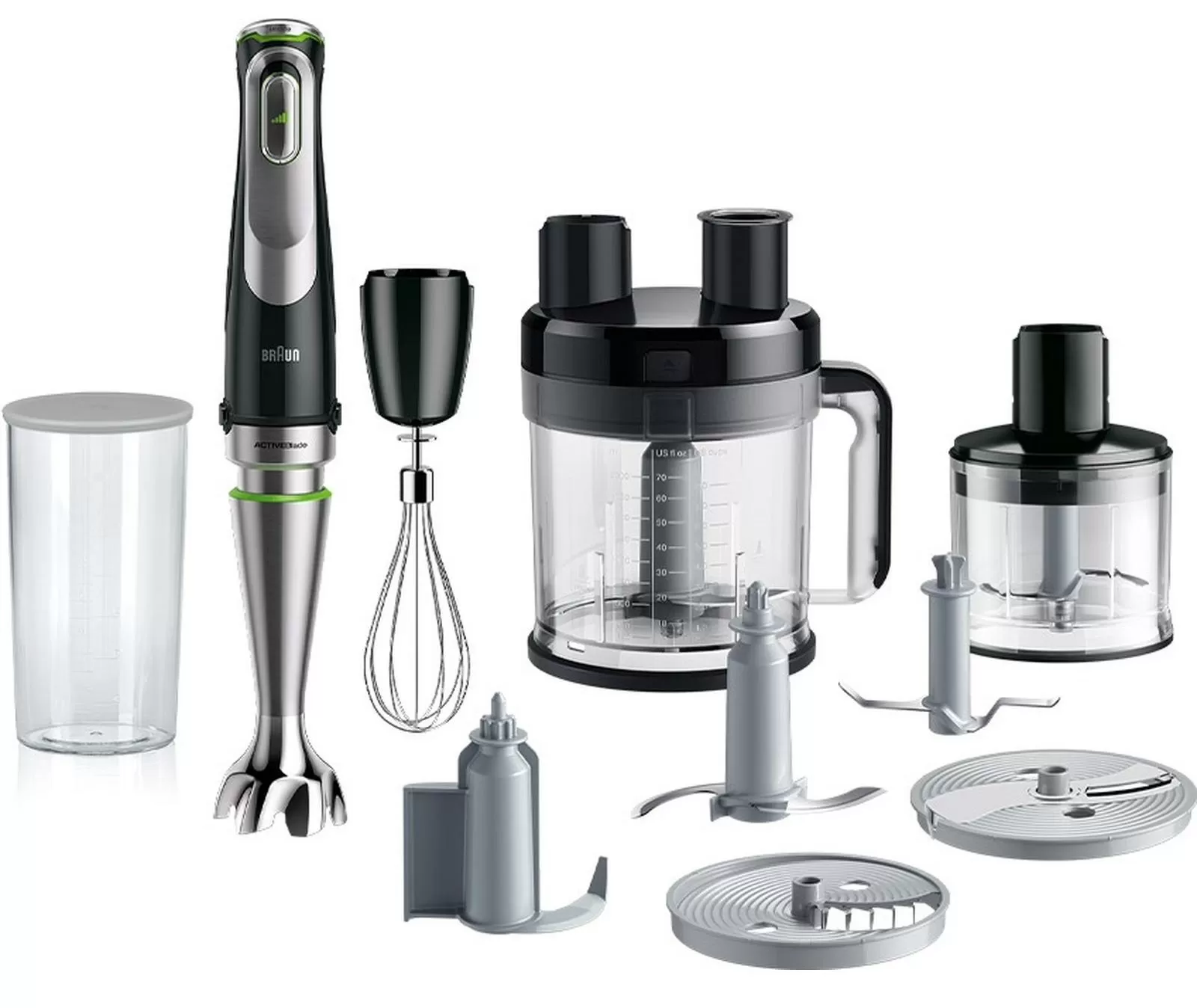- Комплектация множеством насадок — измельчитель, венчик, комбайн и мерный стакан.