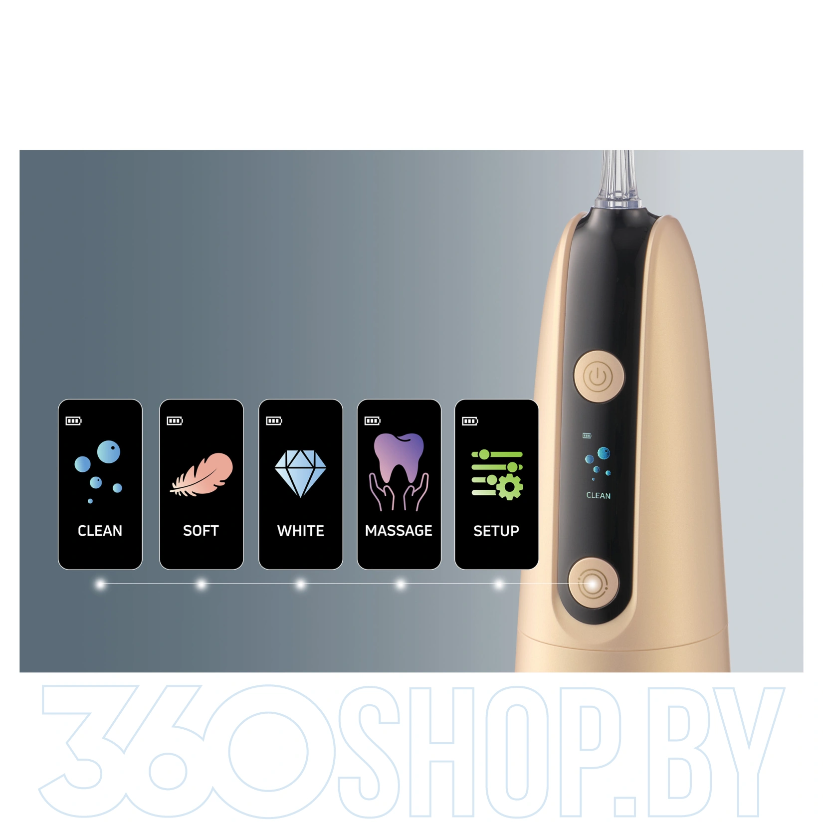 Модель оснащена аккумуляторным питанием, ёмкостью резервуара около 280 мл и частотой пульсации воды порядка 1200–1400 раз/мин, что обеспечивает глубокую и тщательную очистку труднодоступных участков рта. Ирригатор предлагает до 5 режимов работы — мягкий, комфортный, стандартный, пульс и индивидуальный — для разных потребностей чистки. Регулируемый напор и максимальное давление струи до примерно 827 кПа помогают подобрать оптимальную интенсивность под чувствительность дёсен и требуемую глубину очистки. Устройство также защищено по стандарту водонепроницаемости IPX7 для безопасного использования вблизи воды.