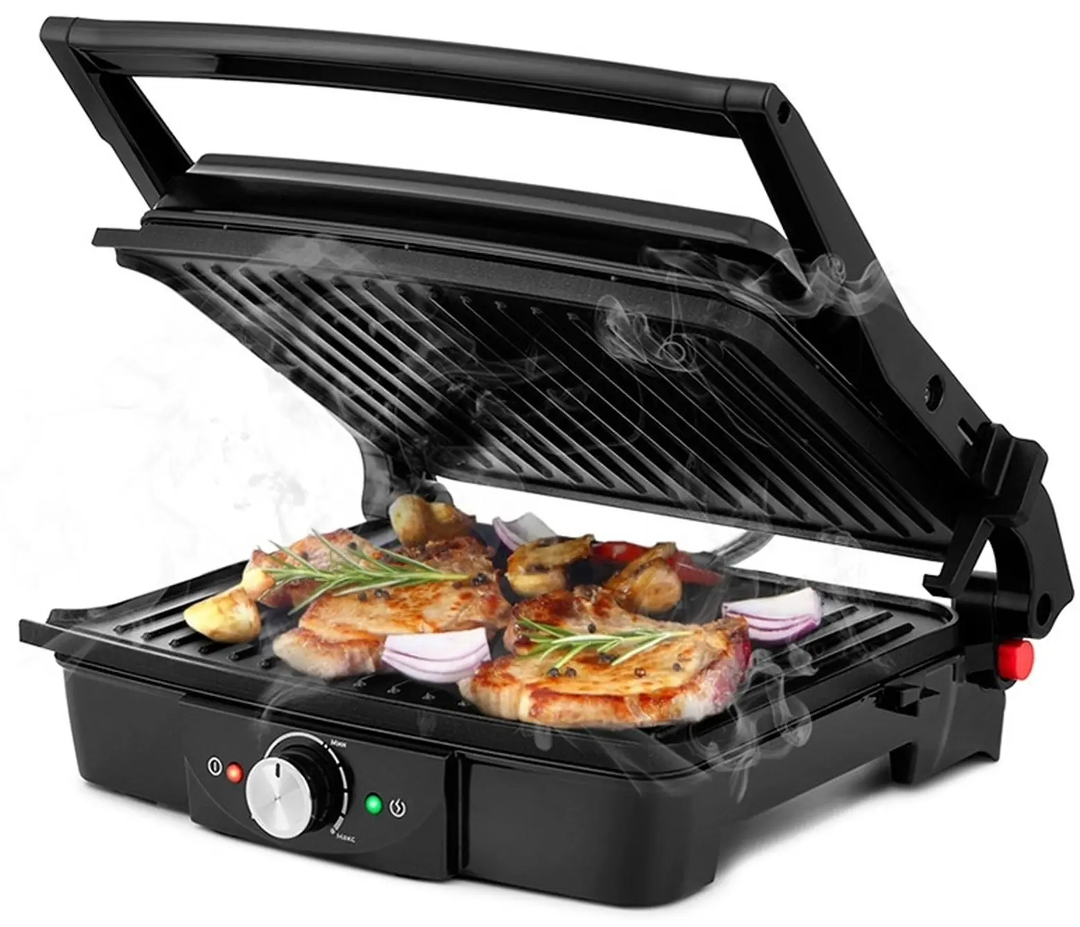 Мощность прибора составляет около 2000 Вт, что обеспечивает быстрый нагрев рабочих поверхностей и равномерное приготовление продуктов. Температурный диапазон регулируется примерно от 100 до 220 °C, позволяя подобрать оптимальный режим под разные рецепты. Размер рабочих панелей около 279×229 мм обеспечивает достаточную площадь для приготовления нескольких порций одновременно. Антипригарное покрытие облегчает уход, а встроенный поддон для жира помогает поддерживать чистоту во время готовки.