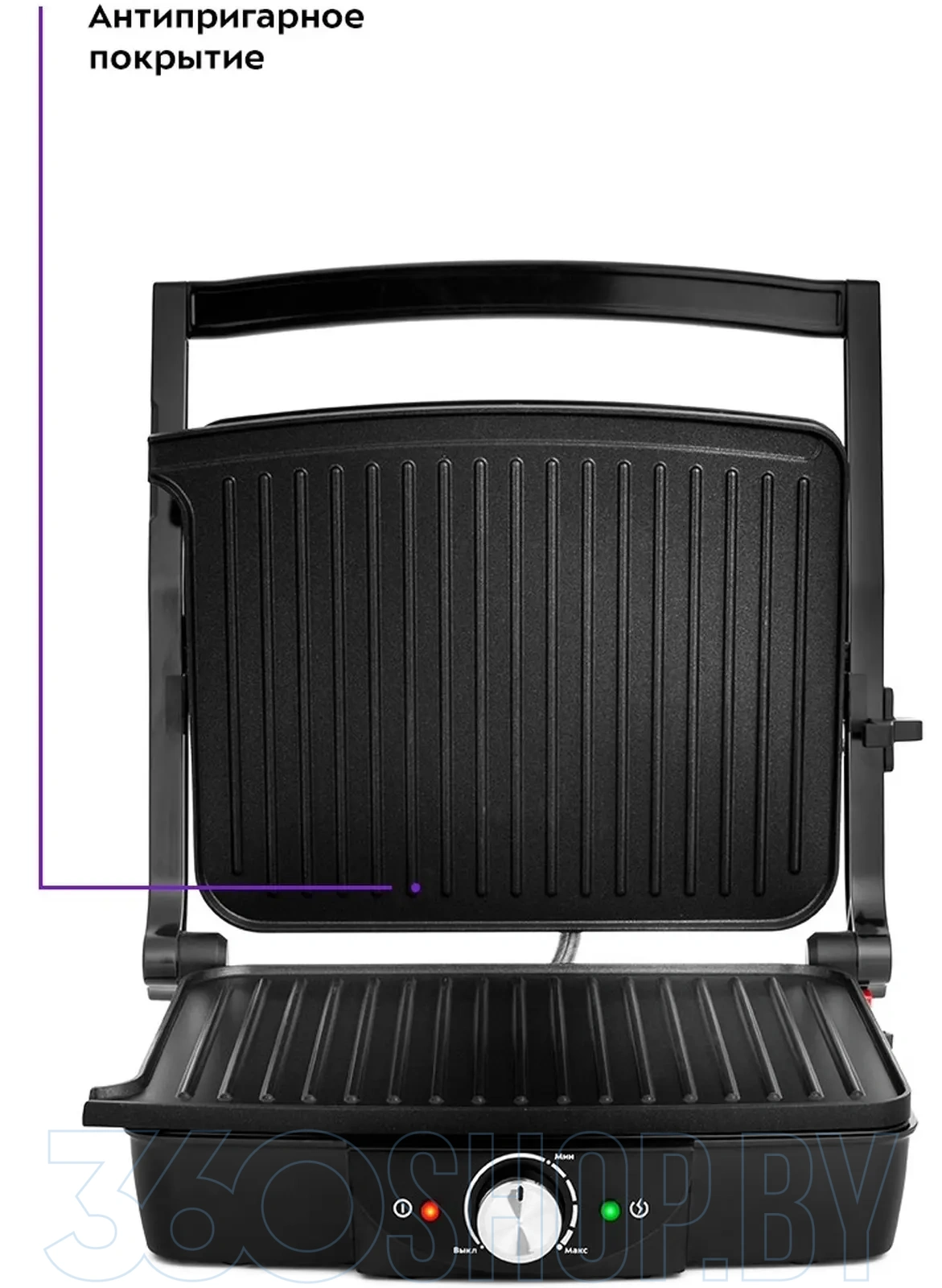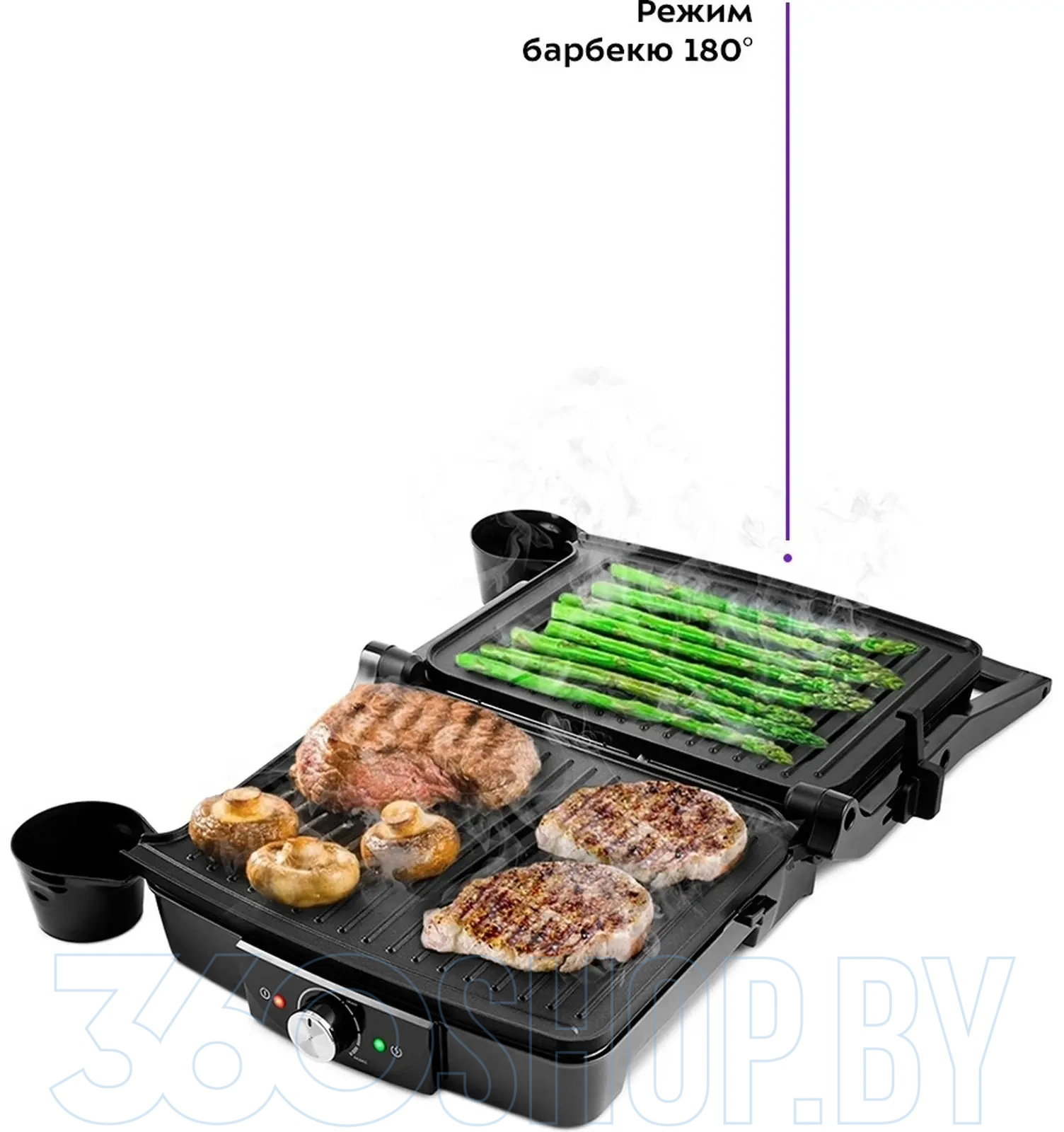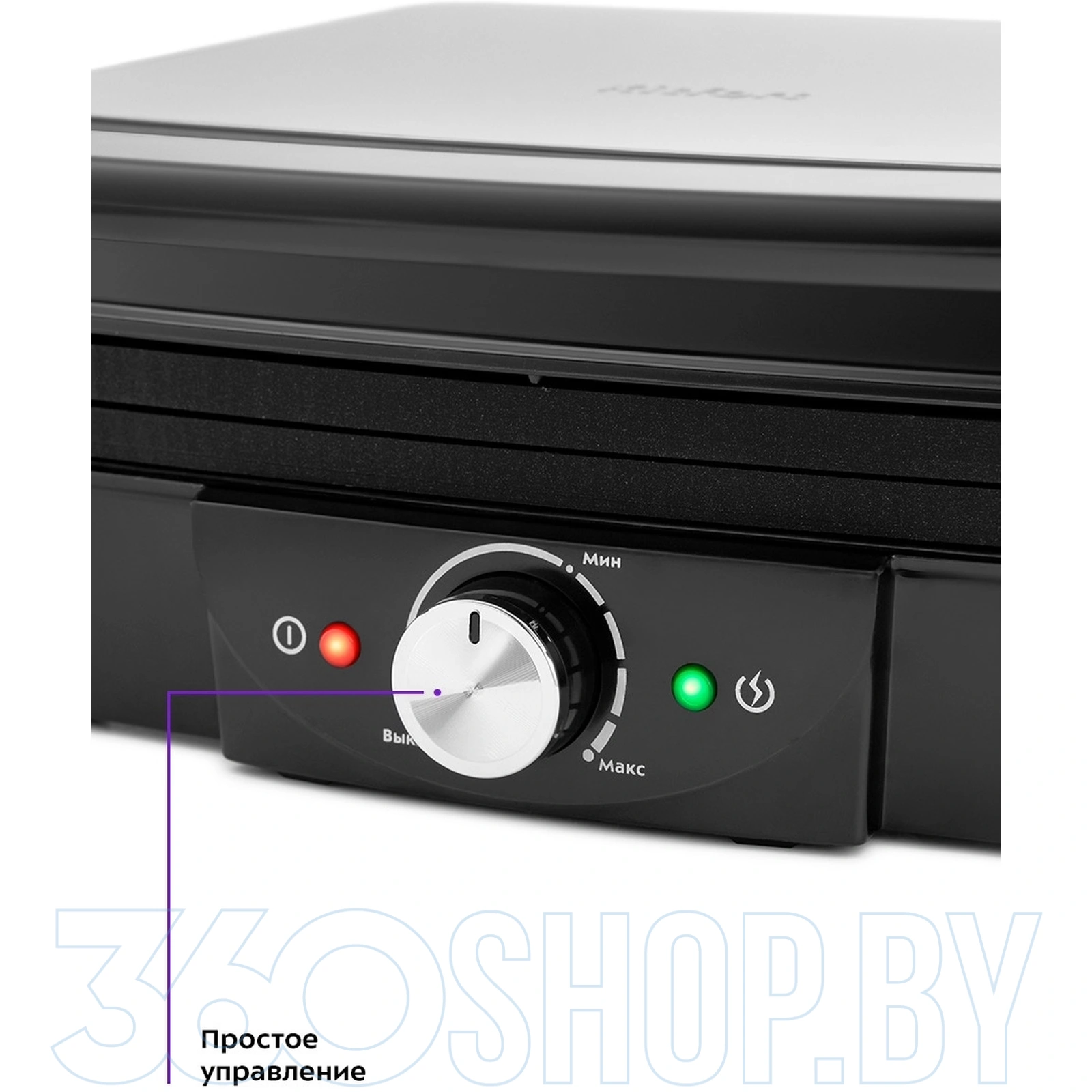 Kitfort KT-1656 поддерживает раскрытие на 180°, превращаясь в большую жарочную поверхность для режима барбекю. Механический регулятор температуры делает управление простым и понятным, а индикаторы питания и нагрева позволяют контролировать процесс приготовления. Компактные размеры и вес около 2,5 кг позволяют легко разместить устройство даже на небольшой кухне, а прорезиненные ножки обеспечивают устойчивость на рабочей поверхности.