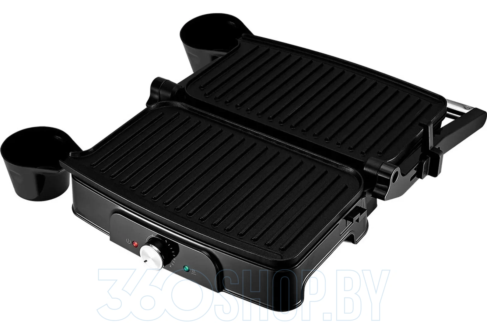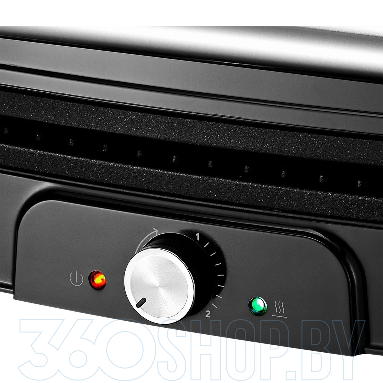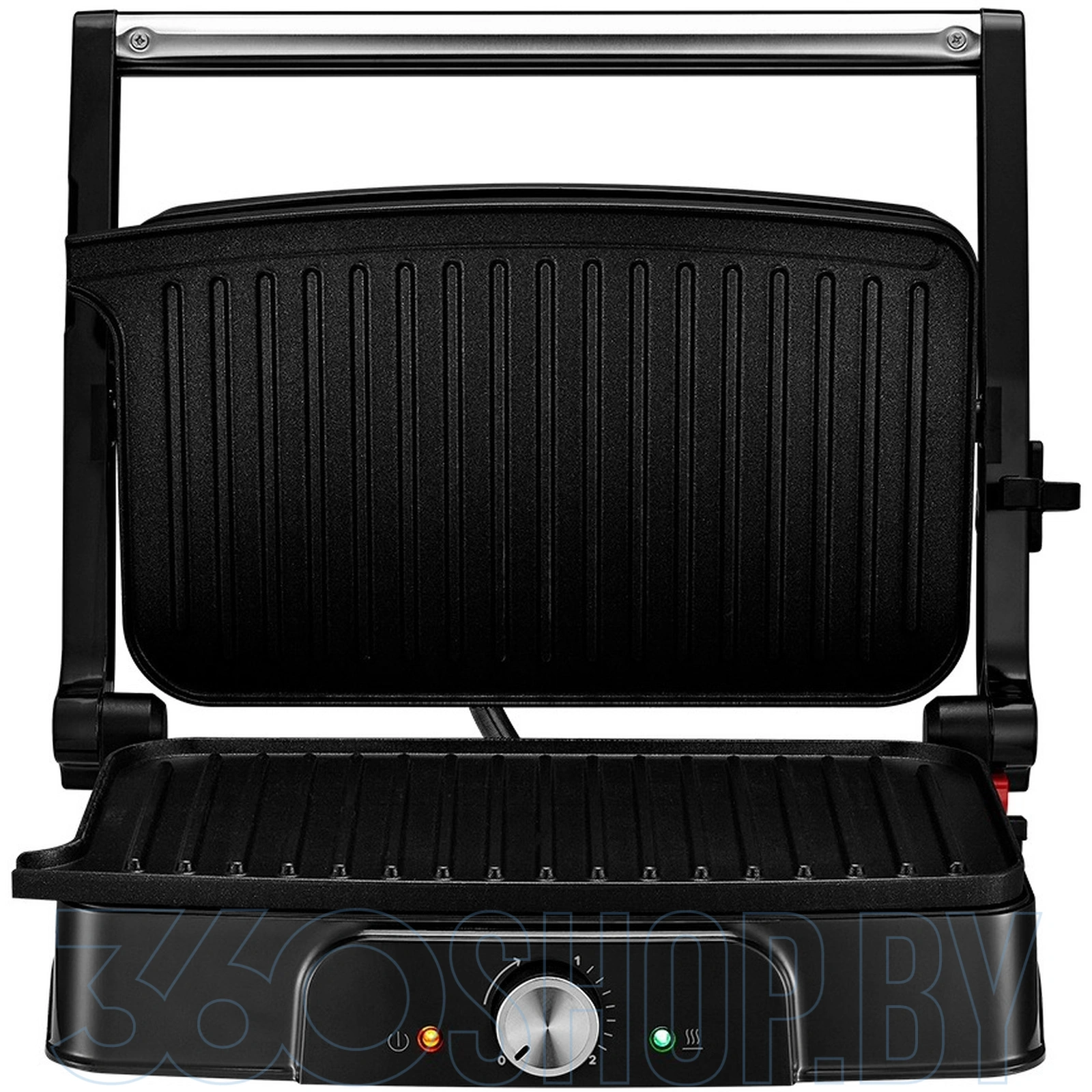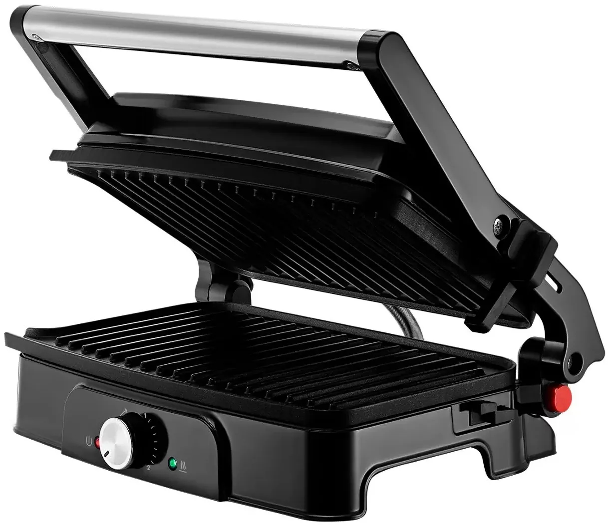 Мощность устройства составляет около 1800–2000 Вт, что обеспечивает быстрый разогрев и стабильную работу при интенсивном использовании. Рабочая поверхность с антипригарным покрытием размером примерно 30×23 см позволяет готовить несколько порций за один цикл. Регулируемый термостат помогает выбрать оптимальную температуру для разных продуктов, а индикатор нагрева подскажет, когда прибор готов к использованию. Конструкция с горизонтальными и вертикальными режимами позволяет использовать гриль как классическую прижимную панель, так и открывать его, превращая в полноценную сковороду.