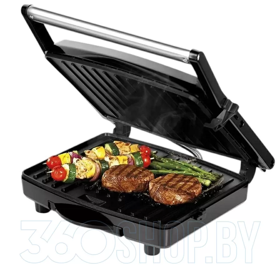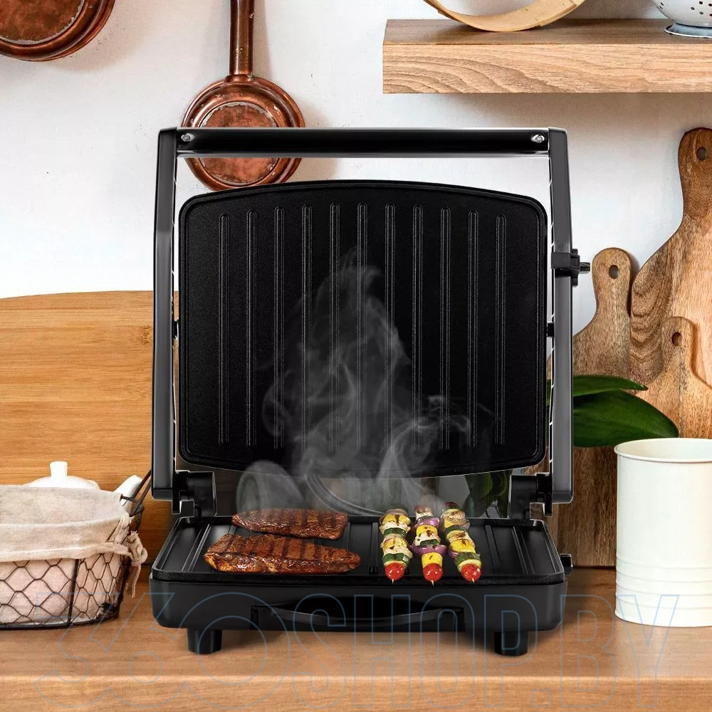 Мощность устройства составляет около 2000 Вт, что обеспечивает быстрый разогрев рабочих поверхностей и стабильную работу при высокой нагрузке. Рабочая поверхность с антипригарным покрытием — примерно 32×25 см — позволяет готовить несколько порций за один цикл. Регулируемый термостат помогает выбрать оптимальную температуру до примерно 230 °C под разные продукты, а индикатор нагрева подскажет, когда прибор готов к использованию. Конструкция позволяет использовать гриль как закрытым, так и открытым, что расширяет возможности приготовления.