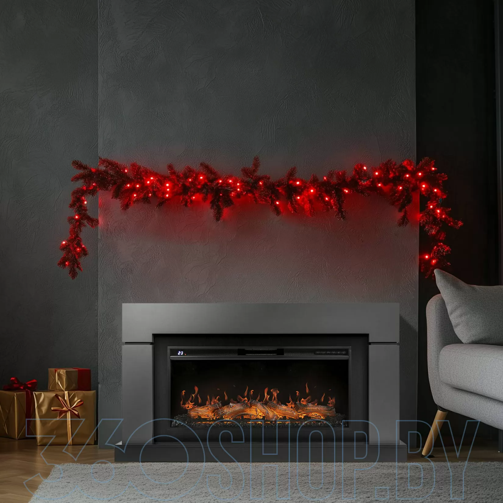 - LED-эффект пламени, звуковое сопровождение, декоративные дрова — реалистичность.