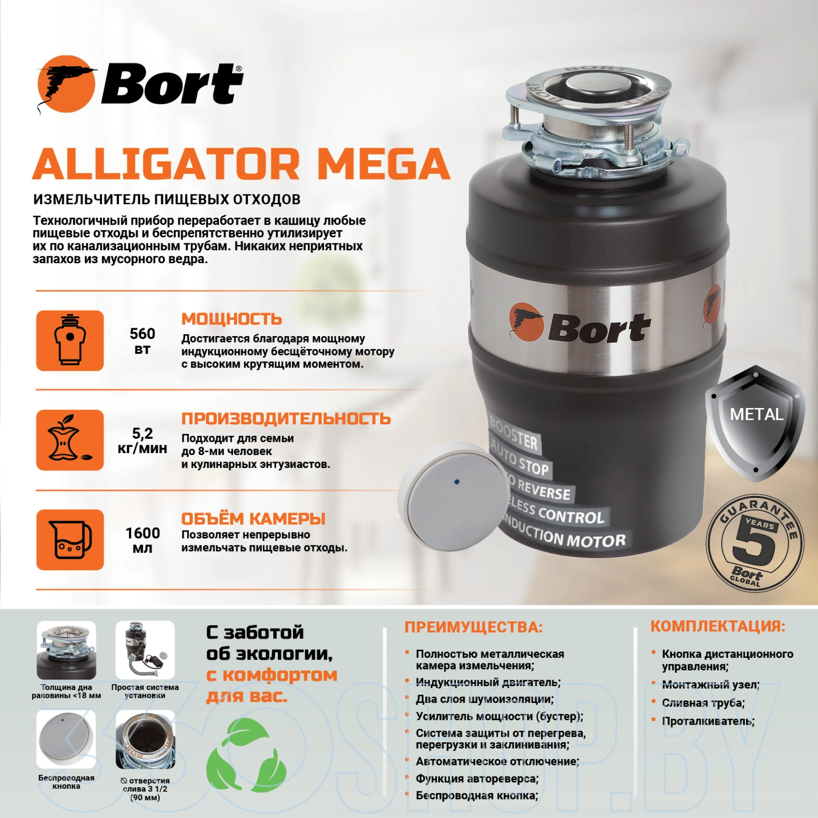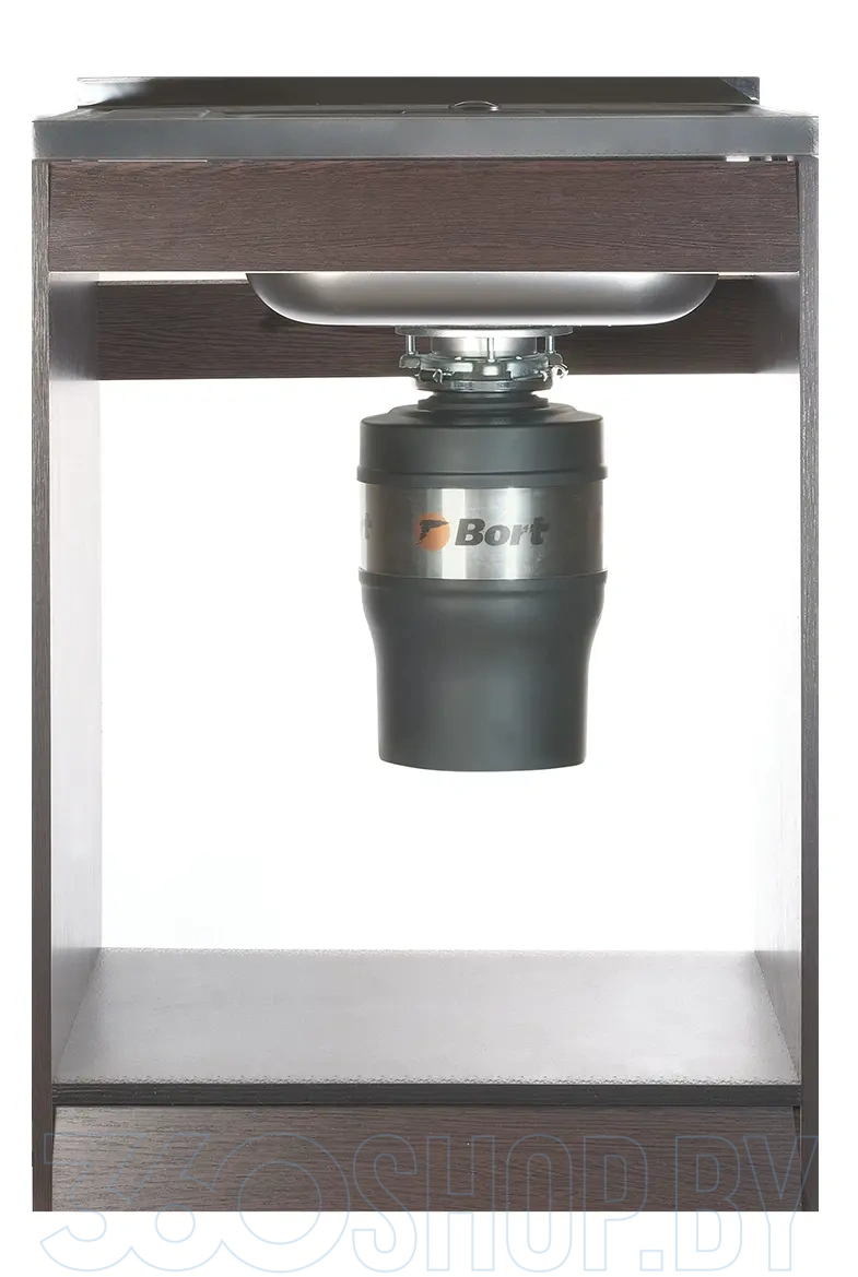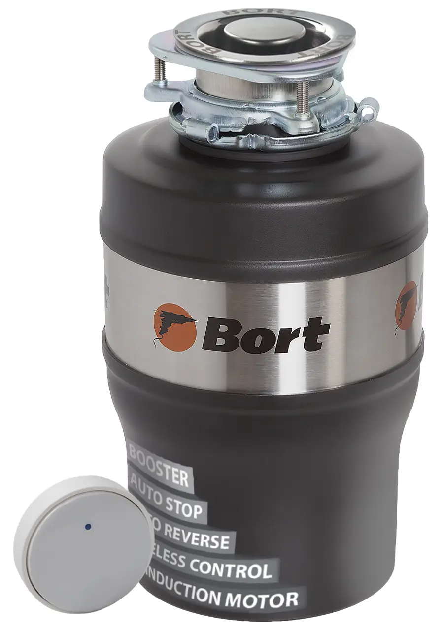 Bort Alligator Mega легко устанавливается под кухонную мойку и подходит для семей до 5–8 человек благодаря высокой производительности и надёжности. Беспроводная кнопка управления облегчает включение прибора, а наличие автоматических функций, таких как усилитель мощности (бустер) и защита от заклинивания, обеспечивает стабильную и безопасную работу. Устройство также допускает подключение слива посудомоечной машины, что делает его ещё более универсальным решением для кухни.