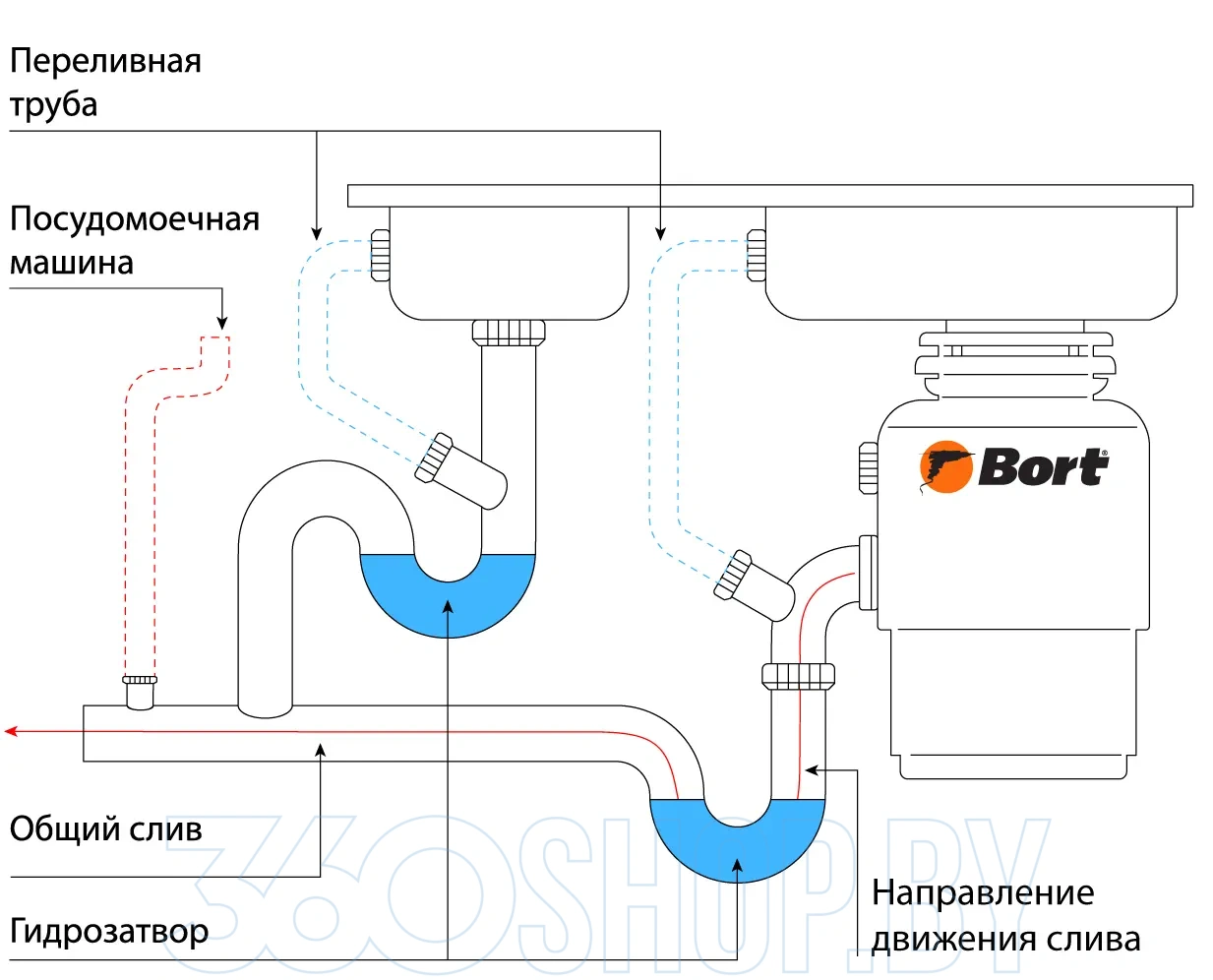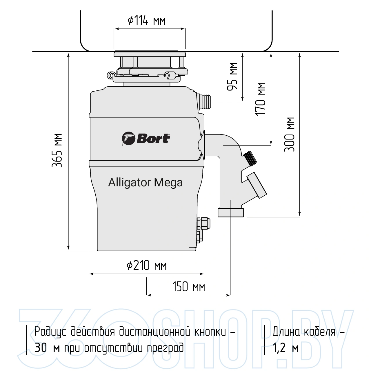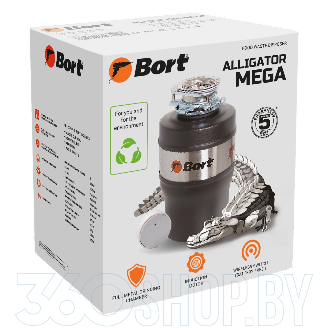 Bort Alligator Mega легко устанавливается под кухонную мойку и подходит для семей до 5–8 человек благодаря высокой производительности и надёжности. Беспроводная кнопка управления облегчает включение прибора, а наличие автоматических функций, таких как усилитель мощности (бустер) и защита от заклинивания, обеспечивает стабильную и безопасную работу. Устройство также допускает подключение слива посудомоечной машины, что делает его ещё более универсальным решением для кухни.