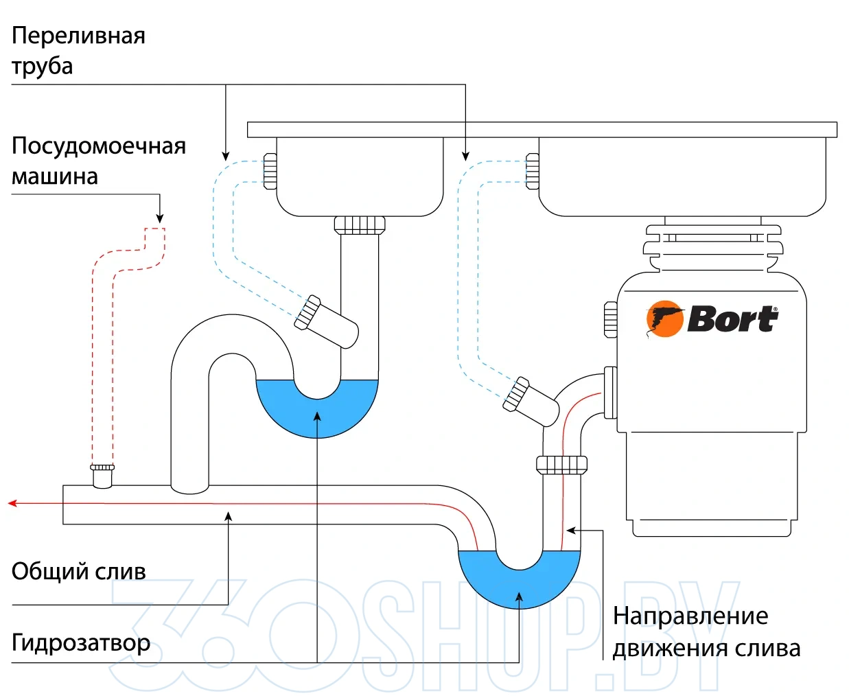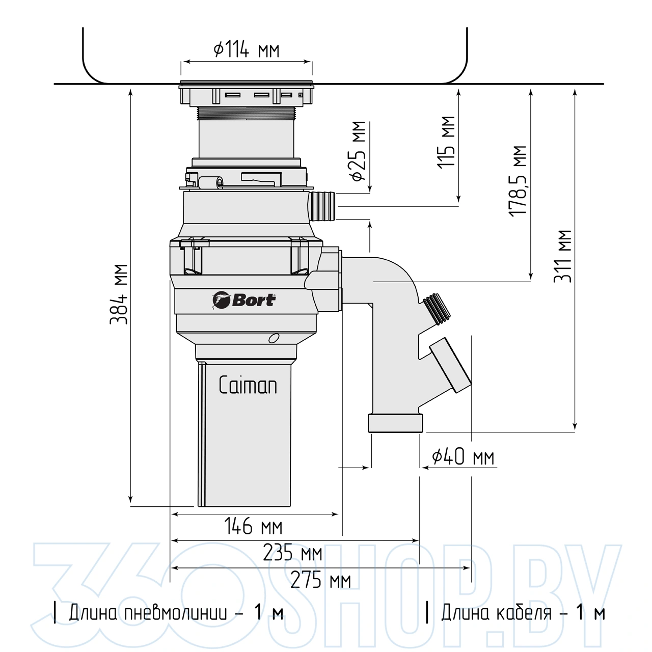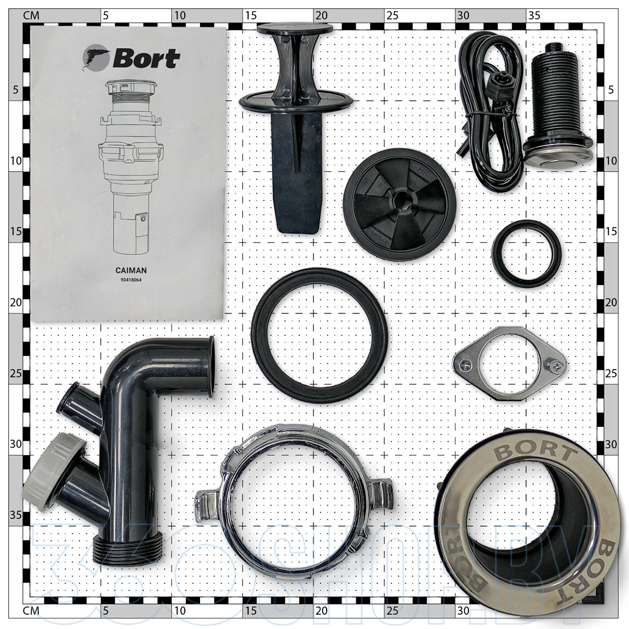 BORT Caiman оборудован пневматической кнопкой управления, которую можно установить прямо на столешницу или мойку для удобного включения. В комплект входят монтажный узел, сливная труба и проталкиватель, что облегчает установку и эксплуатацию. Благодаря своей компактности прибор не занимает много пространства под раковиной, а система защиты от перегрузки обеспечивает безопасную работу. Устройство совместимо с большинством металлических и каменных раковин.