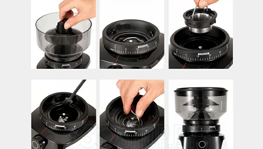 Модель предлагает до 60 уровней помола — от ультратонкого для эспрессо до грубого для френч-пресса, что делает её универсальным решением. Жернова из нержавеющей стали покрыты качественной CNC-обработкой, скорость помола достигает около 460 об/мин, что снижает тепловое воздействие и сохраняет аромат зерна. Контейнер для зерна вмещает до 120–250 г, в зависимости от версии устройства, а антистатическая система предотвращает разлет молотого кофе и делает пространство вокруг чище. Отличительной особенностью является удобный кронштейн-держатель и удобство обслуживания: всё можно легко снять для чистки.