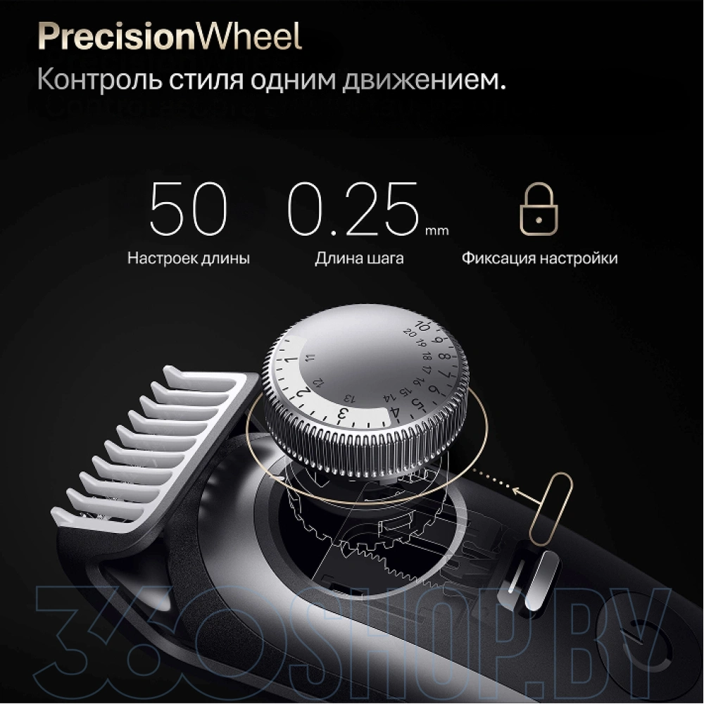 Устройство оснащено системой ProBlade с самозатачивающимися металлическими лезвиями, рассчитанными на длительный срок службы. Регулировка длины выполняется с помощью точного колесика PrecisionWheel с более чем 50 настройками и шагом около 0,25 мм, что позволяет подобрать оптимальную длину от примерно 0,5 до 20 мм. Литий-ионный аккумулятор обеспечивает до 180 минут автономной работы, а быстрая зарядка позволяет подготовить прибор к использованию за короткое время. Корпус полностью водонепроницаем, поэтому триммер можно промывать под водой для лёгкого ухода.