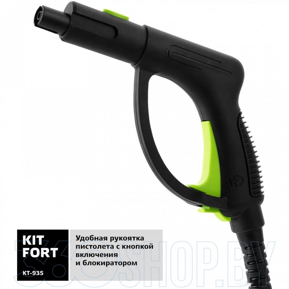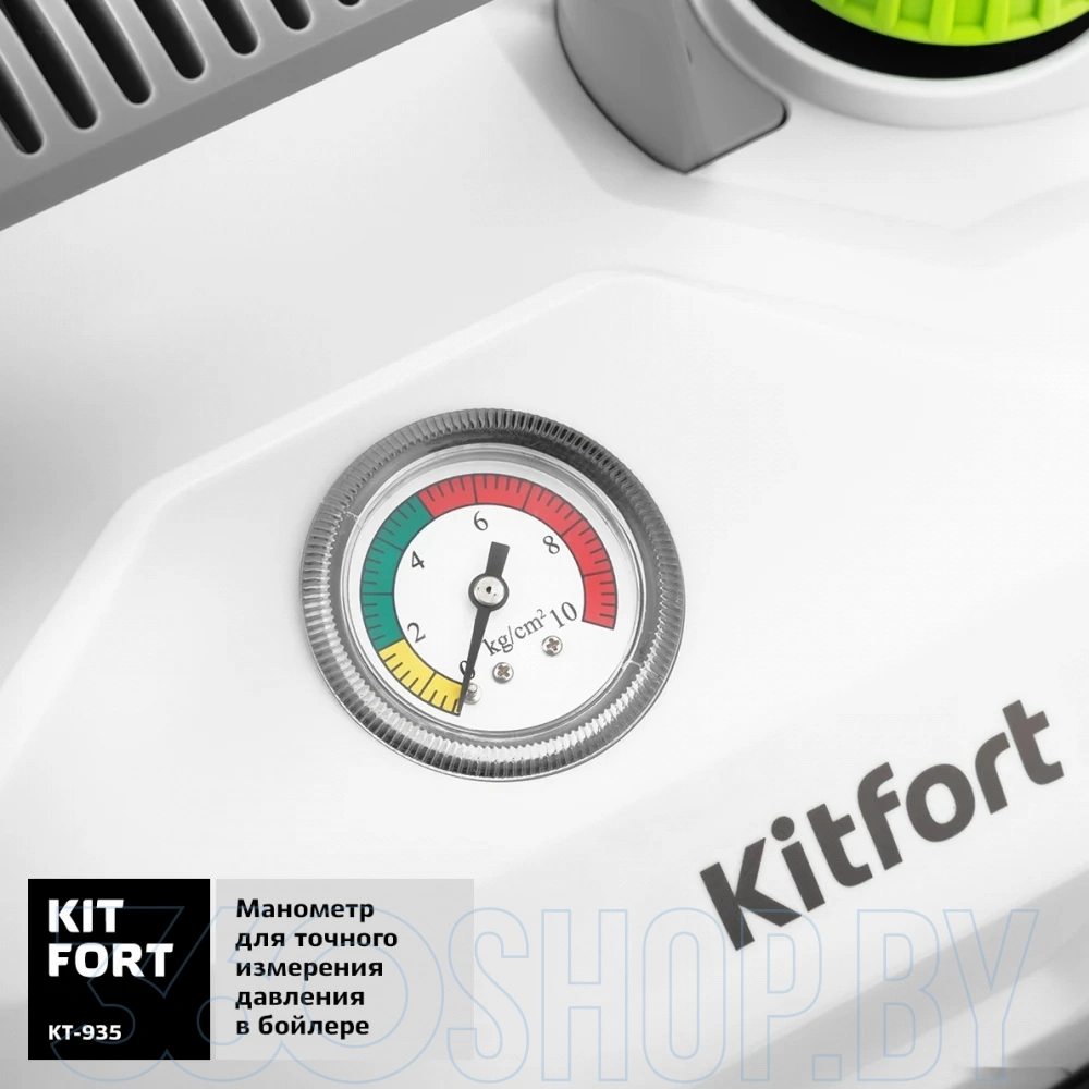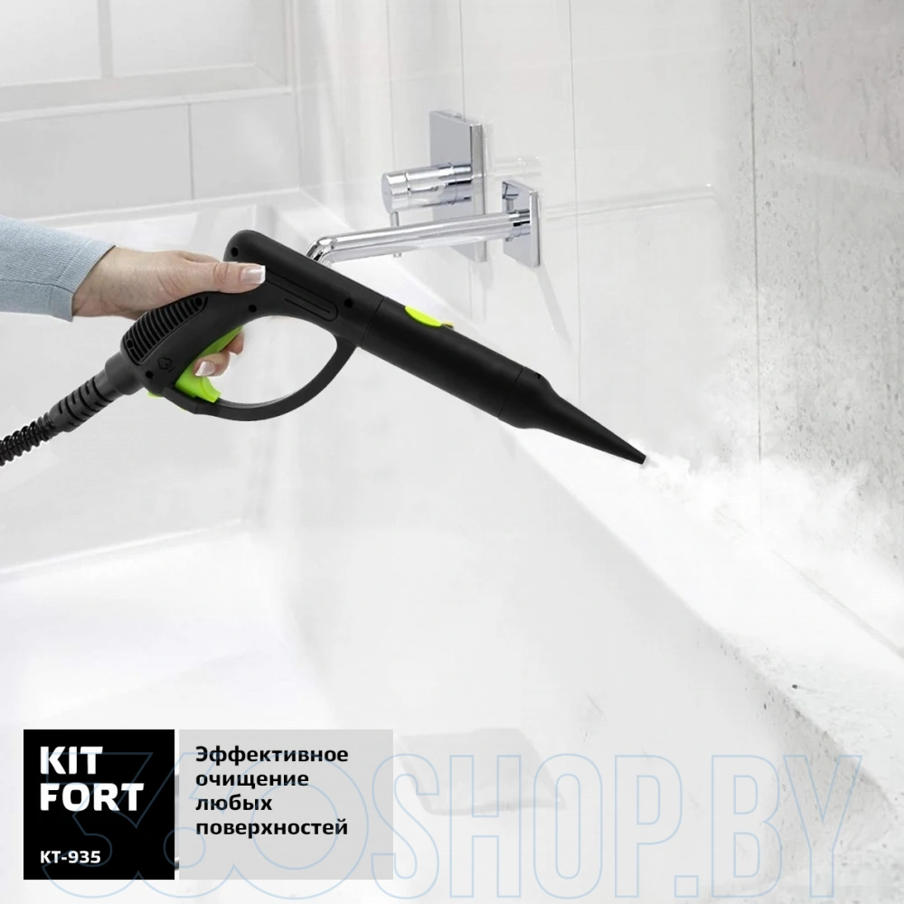 Kitfort KT-935 комплектуется разнообразными насадками: узкой и угловой для труднодоступных мест, щётками для плитки и швов, насадкой для пола и насадкой-отпаривателем для текстиля. Это позволяет использовать прибор для уборки кухни, ванной, зеркал, окон, мебели и тканей. Пароочиститель имеет длинный шланг и удобную рукоятку, что облегчает работу даже на больших площадях. Защита от перегрева и система автоматического отключения повышают безопасность эксплуатации.