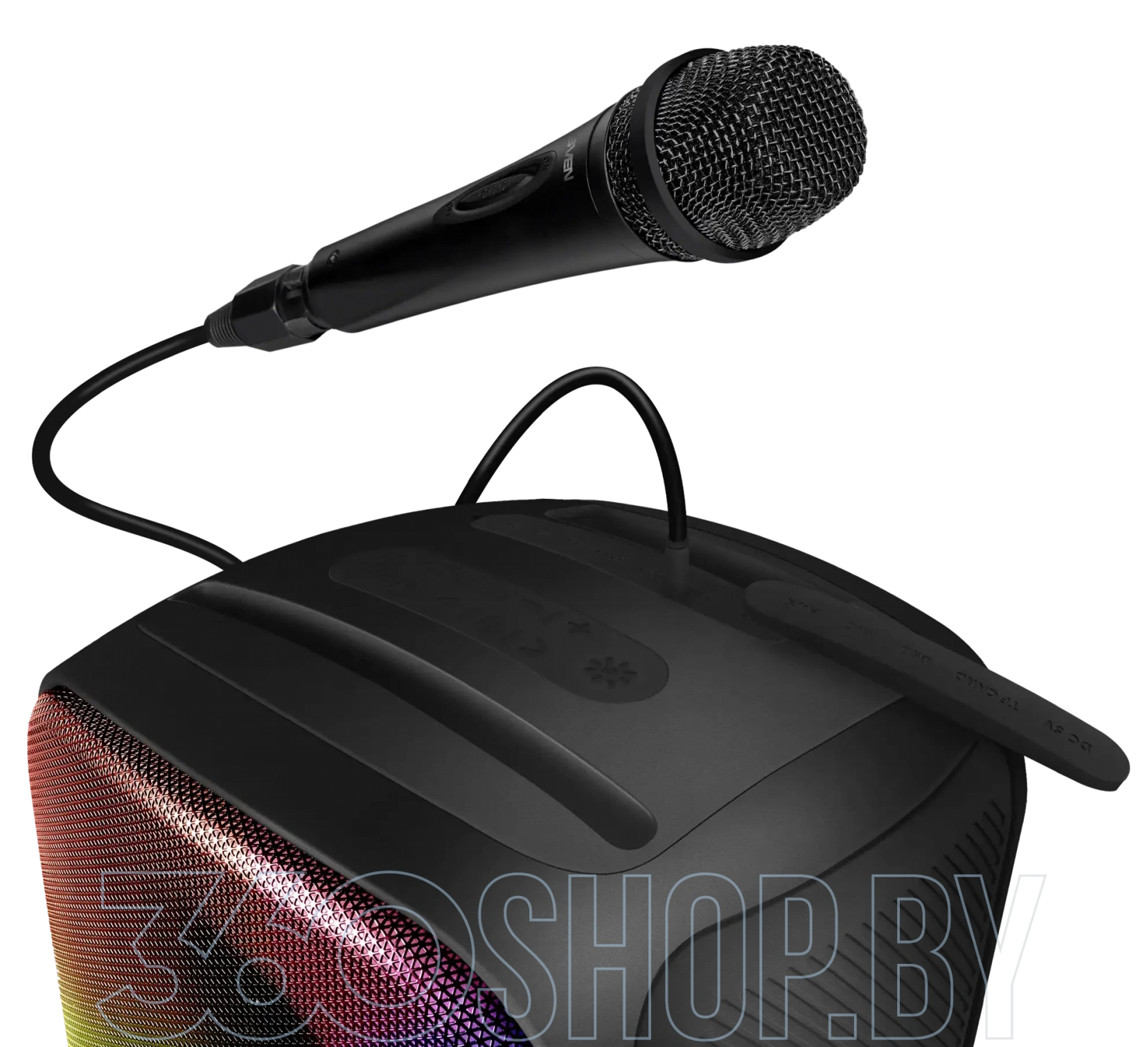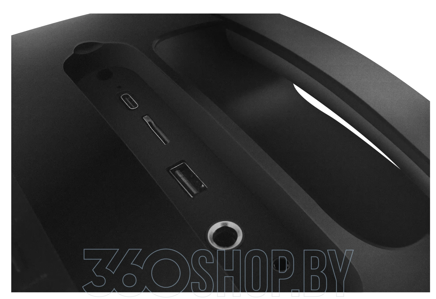 Акустическая система оснащена динамиками суммарной мощностью около 65 Вт, поддерживает Bluetooth-подключение, воспроизведение с USB-накопителей и карт памяти microSD, а также проводное подключение через AUX. Встроенный аккумулятор ёмкостью примерно 4000 мА·ч обеспечивает до 16 часов автономной работы, что позволяет использовать колонку на выезде без постоянной подзарядки. Дополнительные возможности караоке и микрофонный вход делают устройство отличным решением для развлечений.