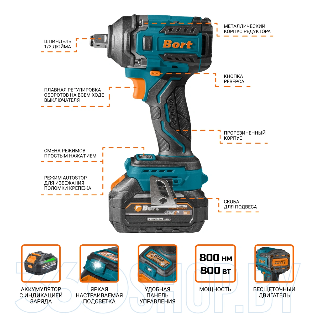 Bort BSR-21U имеет несколько режимов работы и электронное управление, позволяющее точно подобрать усилие под конкретную задачу. Встроенная LED-подсветка облегчает работу в плохо освещённых местах, а реверс помогает быстро менять направление вращения. Эргономичная рукоятка с прорезиненным покрытием снижает вибрации и повышает комфорт при длительном использовании. Инструмент подойдёт как для профессионалов автосервиса, так и для домашнего применения в гараже или мастерской.