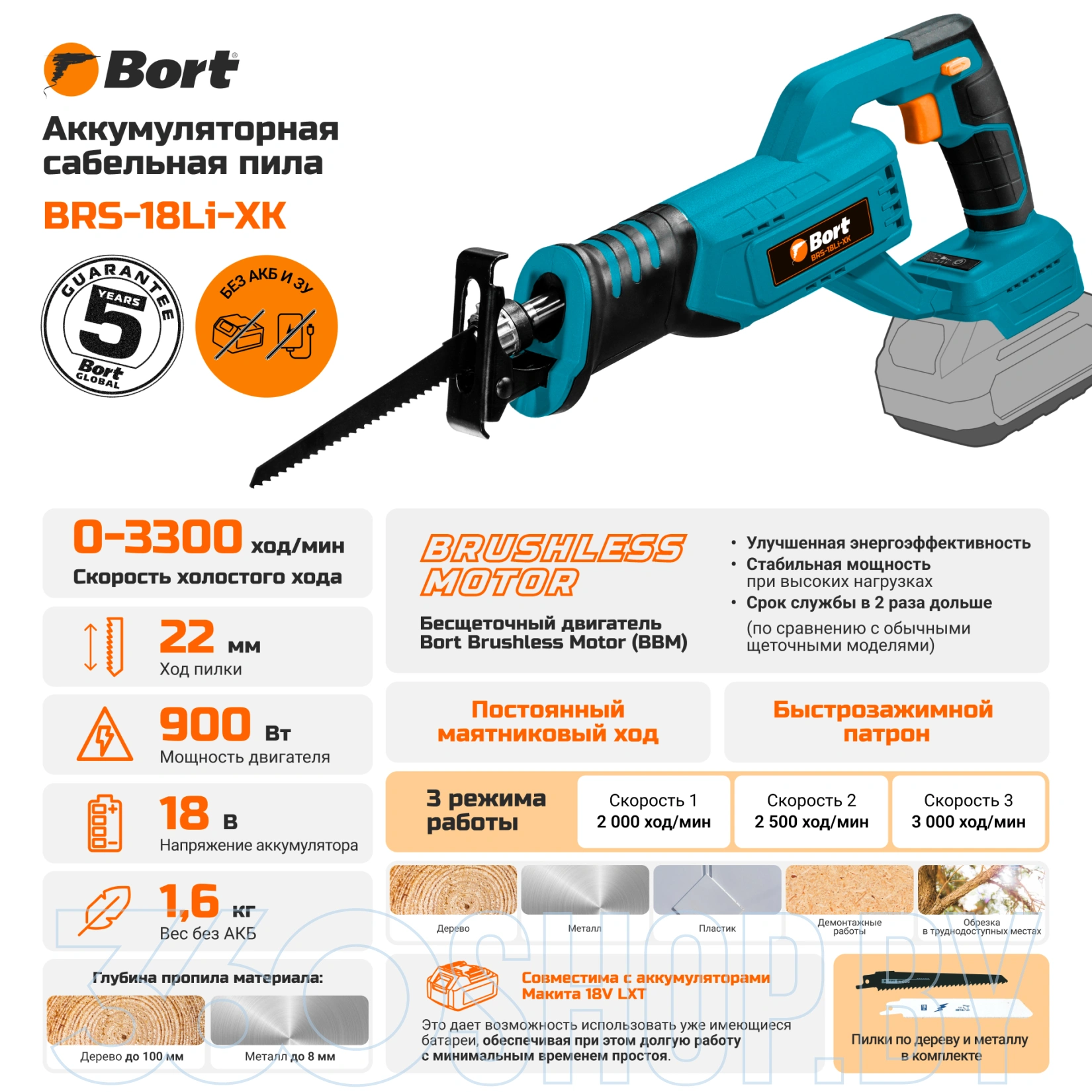 Инструмент работает от аккумулятора напряжением 18 В и оснащён бесщёточным двигателем, обеспечивающим стабильную мощность и увеличенный ресурс. Скорость холостого хода достигает примерно 0–3000 ход/мин, ход полотна составляет около 22 мм, что позволяет эффективно выполнять рез различных материалов. Глубина пропила может достигать порядка 100 мм по дереву и около 8 мм по металлу. Быстрая замена полотна без инструмента упрощает эксплуатацию, а вес около 1,6–1,7 кг делает работу комфортной даже при длительном использовании.