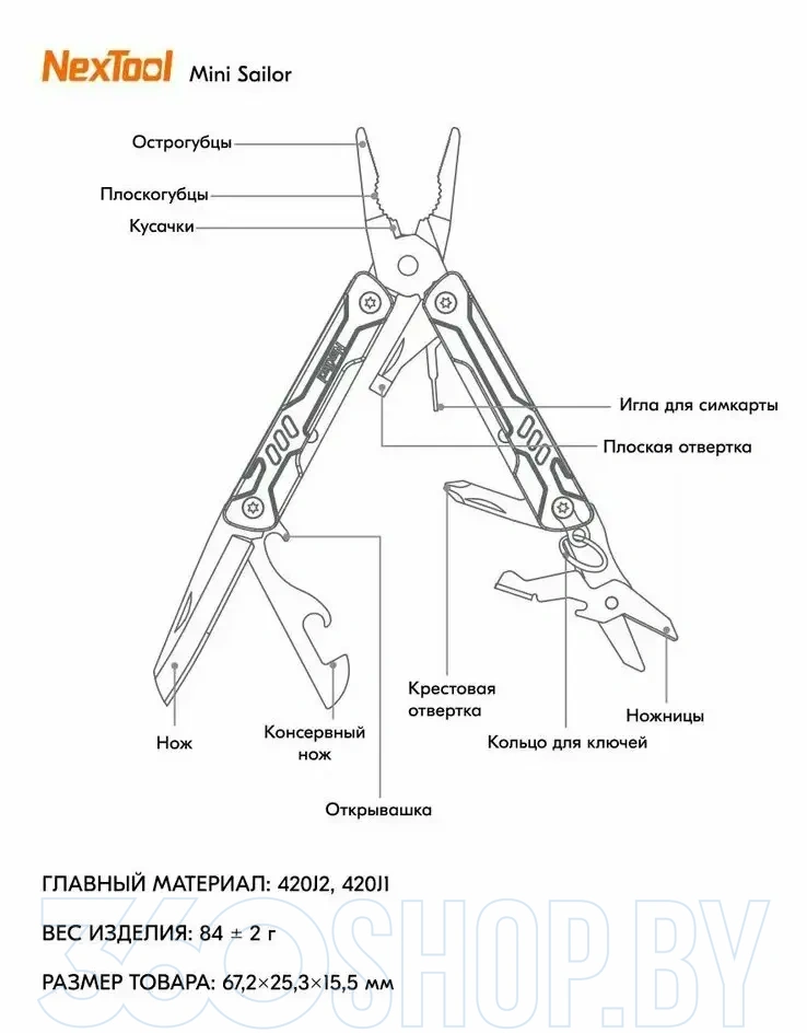 Модель изготовлена из нержавеющей стали марки 420 и имеет длину около 115 мм в сложенном состоянии. Вес составляет примерно 190 г, что делает его удобным для ношения на поясе или в рюкзаке. Инструмент включает 10 функций: плоскогубцы, кусачки, нож, пила, ножницы, открывалка, линейка, шило, крестовая и плоская отвёртки. Корпус оснащён клипсой-зажимом и креплением под карабин — удобно закрепить мультитул на ремне или в сумке.